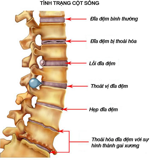 Xảy ra khi sụn khớp và đĩa đệm bị mài mòn theo thời gian, dẫn đến đau nhức, cứng khớp.